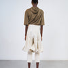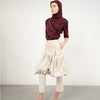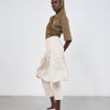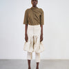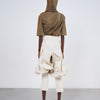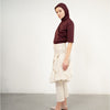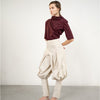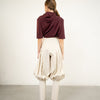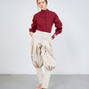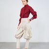 Cut from a structured cotton blend, these trousers reinterpret the traditional Lebanese sharwāl through a sculpted, contemporary lens. The volume gathers softly at the knee before tapering cleanly to the ankle, creating a controlled balloon silhouette that is both architectural and fluid. The high set pleats elongate the leg, while the ivory tone emphasizes clarity, light, and line. A modern statement piece precise, directional, and quietly powerful.
