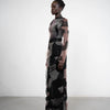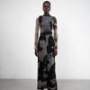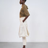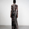 This column skirt is crafted from pure silk organza, grounded by a fluid silk chiffon lining to create depth, opacity, and effortless movement. The silhouette falls straight and long through the body, elongating the frame with quiet clarity. The in house Mutanabbi print plays in shifting scale graphic, shadowed, and softly diffused creating a presence that is poetic yet modern. An evening statement grounded in restraint, proportion, and light.