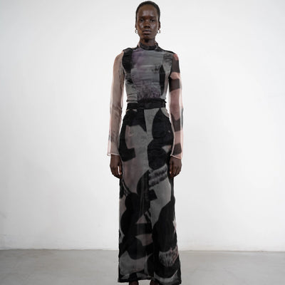 Cut from pure silk organza and lined in silk chiffon, this long sleeve top balances transparency with structure. The in house print translates verses of Al Mutanabbi into abstract gestures of poetry becoming shape, rhythm, and motion across the body. The silhouette is clean and elongated, contouring without clinging, allowing light to move through the fabric. A refined piece that layers seamlessly from day to evening, offering presence without weight.