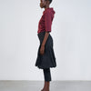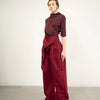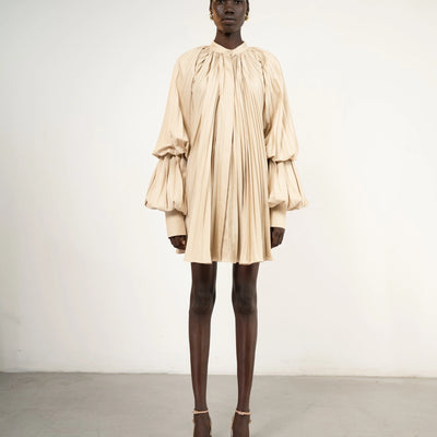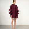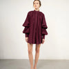 Pleated in-house from a lightweight cotton blend, this blouse dress balances sculptural volume with ease. The gathered collar opens into directional pleats that extend through the body, while the tiered sleeves create deliberate, architectural fullness. In deep maroon, the piece becomes bold, grounded, and quietly powerful, an elevated statement that moves with the wearer.