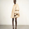 Cut in a crisp cotton blend this blouse explores volume through a controlled architectural lens. The sleeves are gathered at the elbow to create sculptural fullness while the clean stand collar and concealed placket maintain purity and restraint. In beige the silhouette reads fresh and modern the drama is intentional quiet and anchored in structure.