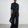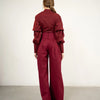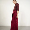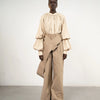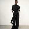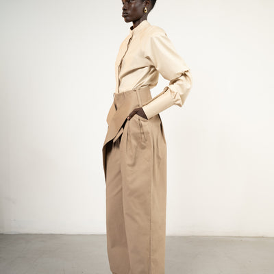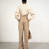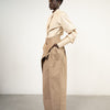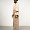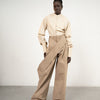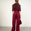 Cut in a structured cotton blend, these wide leg trousers are defined by an architectural wrap belt that can be positioned and tied to sculpt the waist. The pleated volume at the hip tapers cleanly into a long, straight leg, creating a silhouette that feels precise yet fluid. In deep maroon, sandy beige or black, the shape becomes warm, modern, and assured, an intelligent expression of tailoring with movement built into the form.