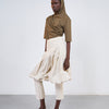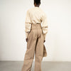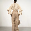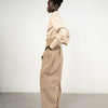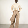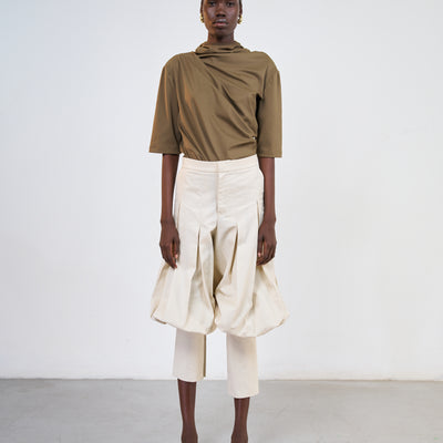 Cut from a structured cotton blend, these trousers reinterpret the traditional Lebanese sharwāl through a sculpted, contemporary lens. The volume gathers softly at the knee before tapering cleanly to the ankle, creating a controlled balloon silhouette that is both architectural and fluid. The high set pleats elongate the leg, while the BEIGE tone emphasizes clarity, light, and line. A modern statement piece, precise, directional, and quietly powerful.