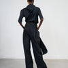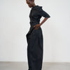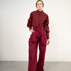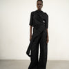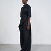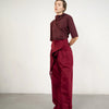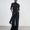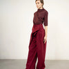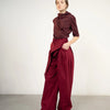 Cut in a structured cotton blend, these wide leg trousers are defined by an architectural wrap belt that can be positioned and tied to sculpt the waist. The pleated volume at the hip tapers cleanly into a long, straight leg, creating a silhouette that feels precise yet fluid. In deep maroon, sandy beige, or black, the shape becomes warm, modern, and assured, an intelligent expression of tailoring with movement built into the form.