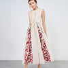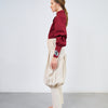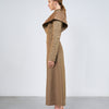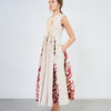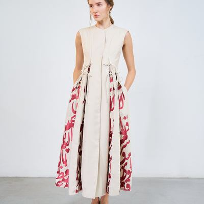 Tailored from a beige cotton wool blend and lined in Italian silk, this wrap silhouette is defined by six maroon stitched panels embroidered with verses of Al Mutanabbi. Worn open, it falls into a fluid, cape-like drape, where the poetry reveals itself in movement a refined interplay of architecture and ease, where tailoring meets motion, and motion reveals meaning.