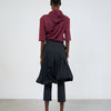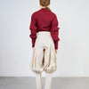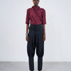 Crafted in a cotton blend with a subtle sheen, this blouse balances sculptural sleeve volume with a sharp, minimal collar line. The gathered shaping at the elbows introduces movement and depth, while the maroon tone grounds the silhouette with warmth and presence. The result is bold yet refined, an elevated staple for a wardrobe built around form and intention.