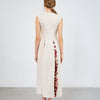 Crafted in a cotton blend with Italian silk contrast lining, this elongated tube silhouette is defined by a shoulder to waist embroidered panel bearing verses of Al Mutanabbi. Worn closed, it forms a sharp, uninterrupted column; worn open, it softens into fluidity and movement. A study in proportion, tension, and controlled ease where poetry becomes part of the line of the body.
